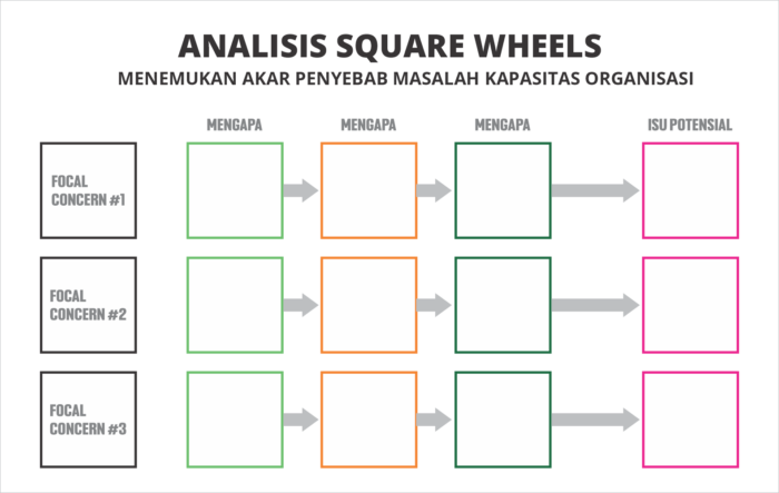 Pada hari ketiga, sesi lokakarya masih dilanjutkan untuk mengidentifikasi focal concern melalui tools Square Wheels (SW), yaitu suatu alat pengukuran yang bertujuan utnuk dapat menemukan strategi keberlanjutan yang transformatif. Dalam pendekatan diskusi ini, fasilitator menggunakan pendekatan meraforik dimana, semua tim LRC melihat media gambar “gerobak dengan roda segi empat”. Gambar ini diibaratkan sebagai organisasi LRC dan semua tim LRC diharuskan dapat menginterpretasikan gambar tersebut untuk mencari “sesuatu permasalahan” yang selama ini belum dapat dijawab oleh organisasi.