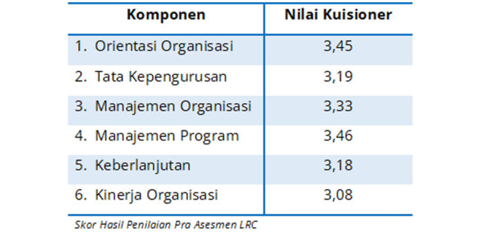 Proses kalibrasi pra-asesmen ini melibatkan diskusi mendalam mengenai hasil penilaian mandiri yang dilakukan oleh staf LRC. Diskusi terfokus pada beberapa aspek krusial yang menentukan kesehatan dan efektivitas LRC sebagai sebuah organisasi. Aspek-aspek tersebut meliputi orientasi organisasi, yang menyangkut visi dan misi; tata kepengurusan; dan manajemen organisasi secara umum. Pengkajian ini memberikan dasar faktual untuk setiap langkah pengembangan kapasitas di masa mendatang.