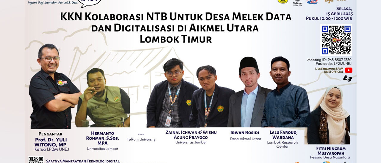 Lembaga Penelitian dan Pengabdian Masyarakat (LP2M) Universitas Jember (Unej) menggelar acara webinar yang berjudul “Ngobrol Pagi Selaraskan Asa untuk Desa (Ngopi Selasa) edisi 105″ dengan tema ” KKN Kolaborasi NTB untuk Desa Melek Data dan Digitalisasi di Aikmel Lombok Timur”. Acara webinar tersebut menghadirkan narasumber Zainal Ichwan dan Wisnu Agung Prayoga sebagai perwakilan dari mahasiswa KKN 3T Kolaboratif NTB, Hermanto Rohman dan Muhammad Al Makky selaku pembimbing mahasiswa KKN, irwan Rosidi dari Pemdes Aikmel Utara, dan L. Farouq Wardhana dari Lombok Research Center (LRC). Adapun peserta webinar Ngopi Selasa yang dilaksanakan pada 15 April 2025 tersebut diikuti oleh akademisi, pemerintah desa, NGO dan mahasiswa di seluruh Indonesia.